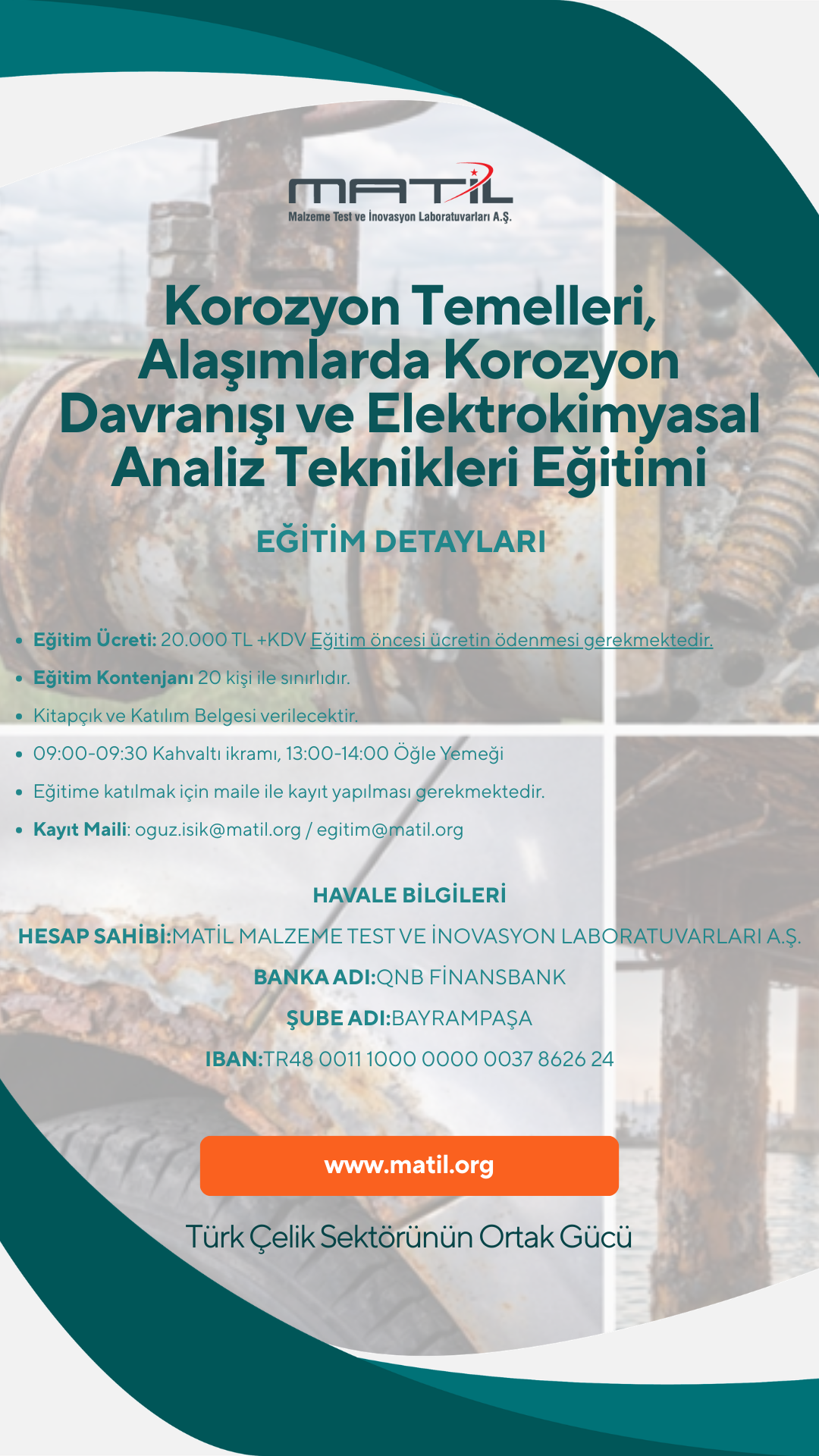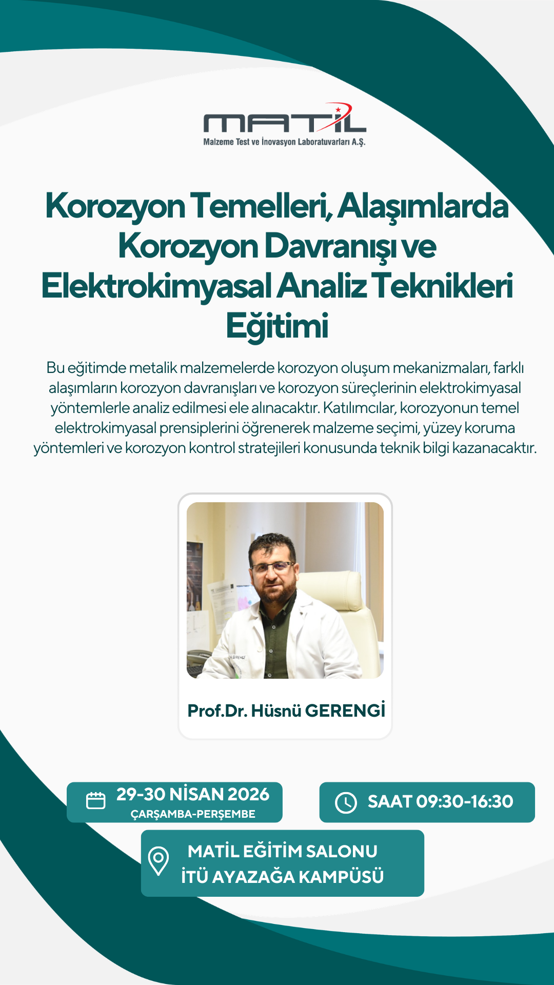 29–30 Nisan 2026 / Çarşamba–Perşembe günleri MATİL eğitim salonunda Prof. Dr. Hüsnü GERENGİ tarafından 2 gün sürecek “Korozyon Temelleri, Alaşımlarda Korozyon Davranışı ve Elektrokimyasal Analiz Teknikleri” eğitimi verilecektir.