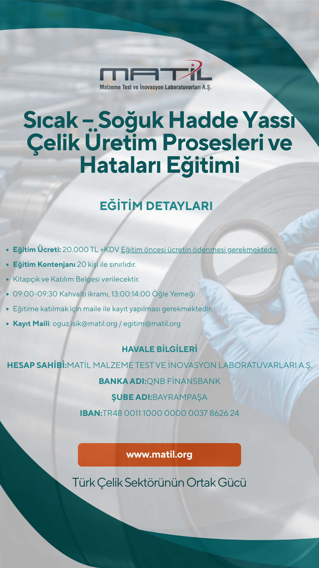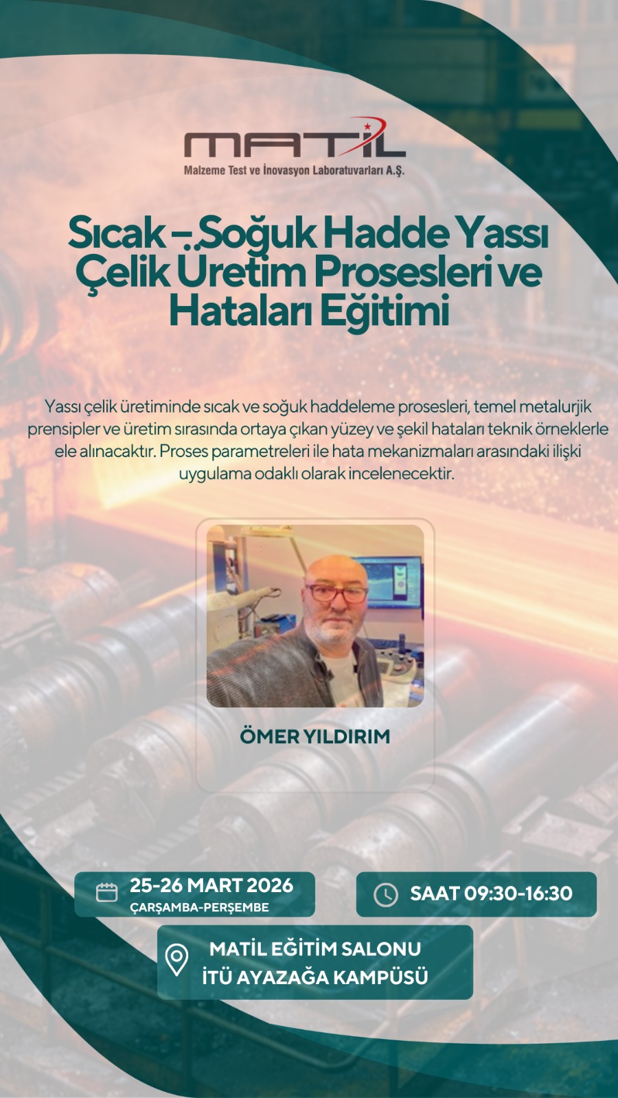 25–26 Mart 2026 / Çarşamba–Perşembe günleri MATİL eğitim salonunda Ömer YILDIRIM tarafından 2 gün sürecek “Sıcak – Soğuk Hadde Yassı Çelik Üretim Prosesleri ve Hataları” eğitimi verilecektir.