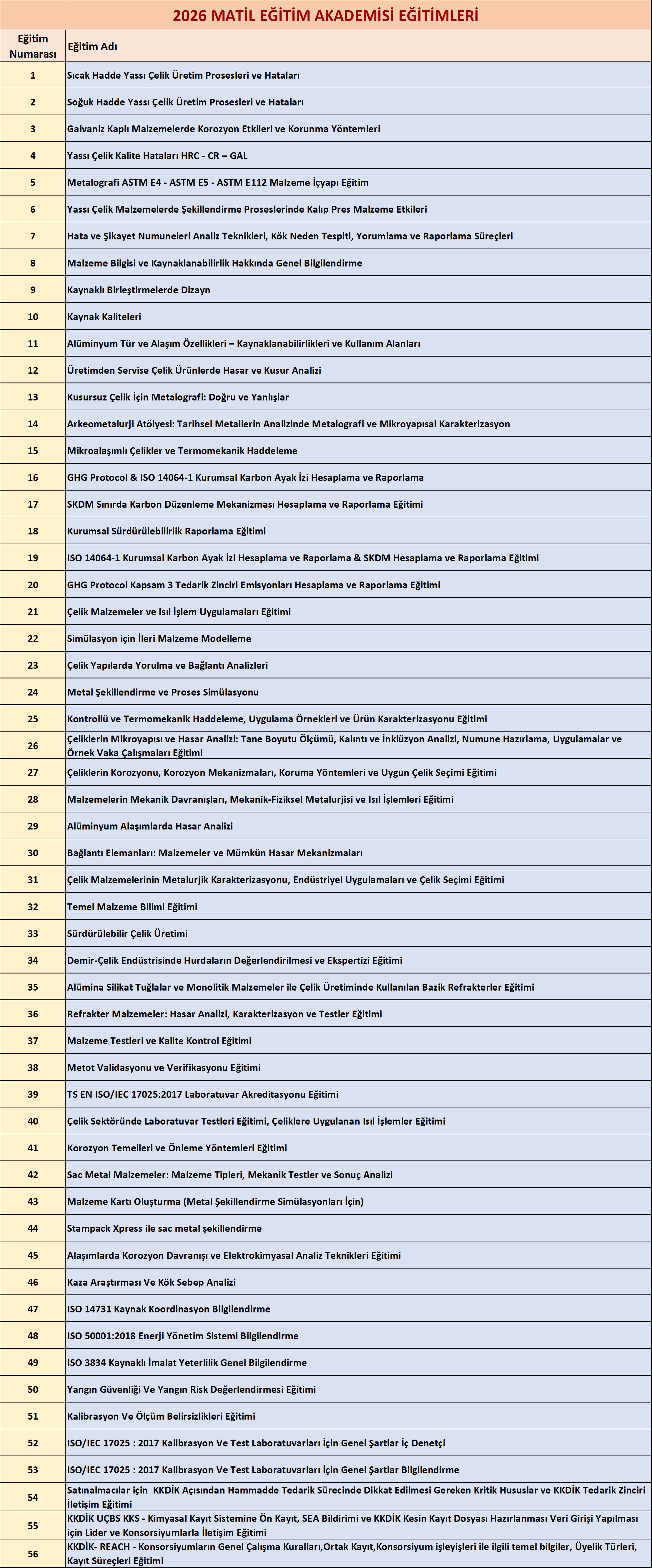 Çelik üreten, çelik kullanan, test eden ve kalite süreçlerini yöneten tüm sektör paydaşları için hazırladığımız 2026 MATİL Eğitim Akademisi Programı, toplam 56 başlıkta teknik yetkinlik eğitimi ile yayındadır.