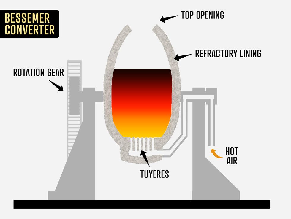 South Yorkshire. Circa 1916. GETTY IMAGESSSPLThe impact of this explosive smelting incident is hard to overstate. When Bessemer used the bellows directly on the molten pig iron, the carbon bonded with the oxygen from the air blasts, leaving behind pure iron that—through the addition of carbon-bearing materials such as spiegeleisen, an alloy of iron and manganese—could easily be turned into high-quality steel.