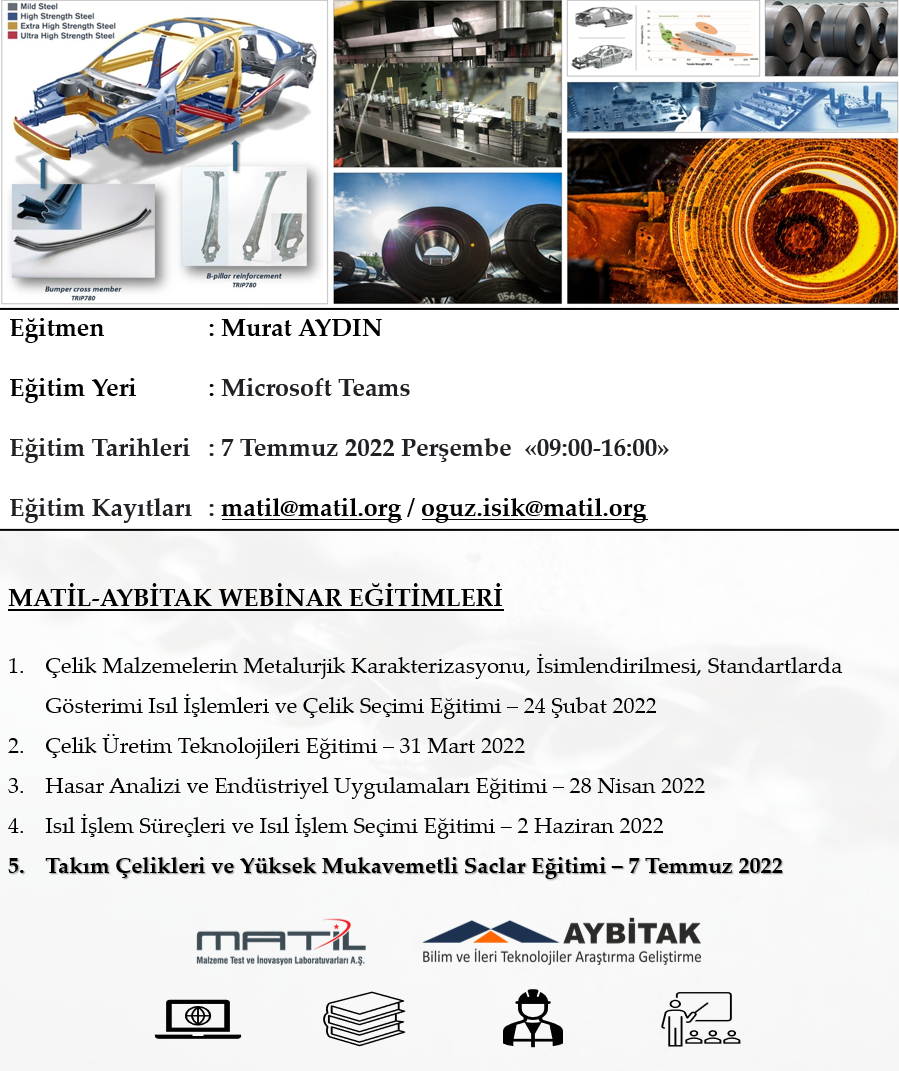 7 Temmuz 2022 / Perşembe günü MATİL 'de online olarak demir çelik üretimi alanında uzman Murat AYDIN tarafından 1 gün sürecek “Takım Çelikleri ve Yüksek Mukavemetli Saclar” eğitimi verilecektir.
